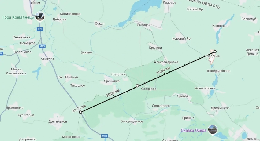 Но продвижение в районе Нитриуса - это не о только «о Красном Лимане». Есть там и стратегическое направление - в сторону автомобильной дороги М03, которая соединяет Харьков и Изюм со Славянско-Краматорской агломерацией. При учёте того, что ВС РФ перерезали кратчайший путь из Покровска в Краматорск и Славянск, взятие указанного на карте участка дороги М03 как минимум под огневой контроль может привести к тяжелейшим последствиям для гарнизонов врага в этих городах. На данный момент до автодороги с северо-востока - 26-27 км. То есть, для обычной артиллерии - вполне подходящая дистанция.