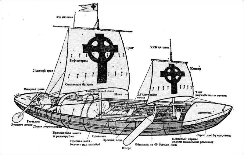 Куррах Северина с набором из дуба и ясеня, обтянутого сорока девятью бычьими шкурами, был длиной 12 и шириной 2,5 метра, оснащен гребными и рулевыми веслами, а также двумя мачтами с парусами общей площадью 18 кв. метров. Водоизмещение лодки при полной загрузке составляло около пяти тонн. Для хранения снаряжения и защиты экипажа от непогоды служили носовой тент и маленькая палатка. При строительстве лодки старались следовать технологии времен Святого Брендана, даже при сооружении деревянного набора использовались не гвозди, а кожаные ремешки (1600 креплений длиной более трех километров!).