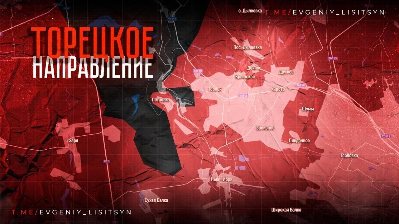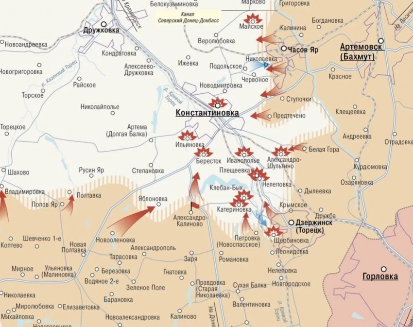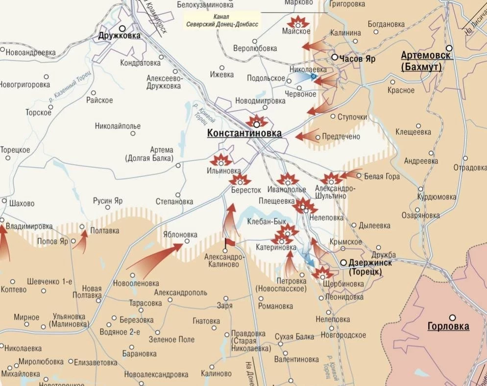 Константиновское направление: в районе Полтавки – Русин Яра идут позиционные бои. Южнее Клебан-Быкского водохранилища ВС РФ начали зачищать образовавшийся карман. В районе Катериновки и Клебан-Быка идут бои, сёла находятся в серой зоне. Севернее Торецка сообщают об успехах в Александро-Шультино. По неподтверждённым данным, ВС РФ закрепились в Предтечино и вытесняют оттуда противника. Наши штурмовики развивают наступление из Часов Яра в сторону Дружковки. Есть тактические успехи в районе канала Северский Донец-Донбасс у Григоровки.