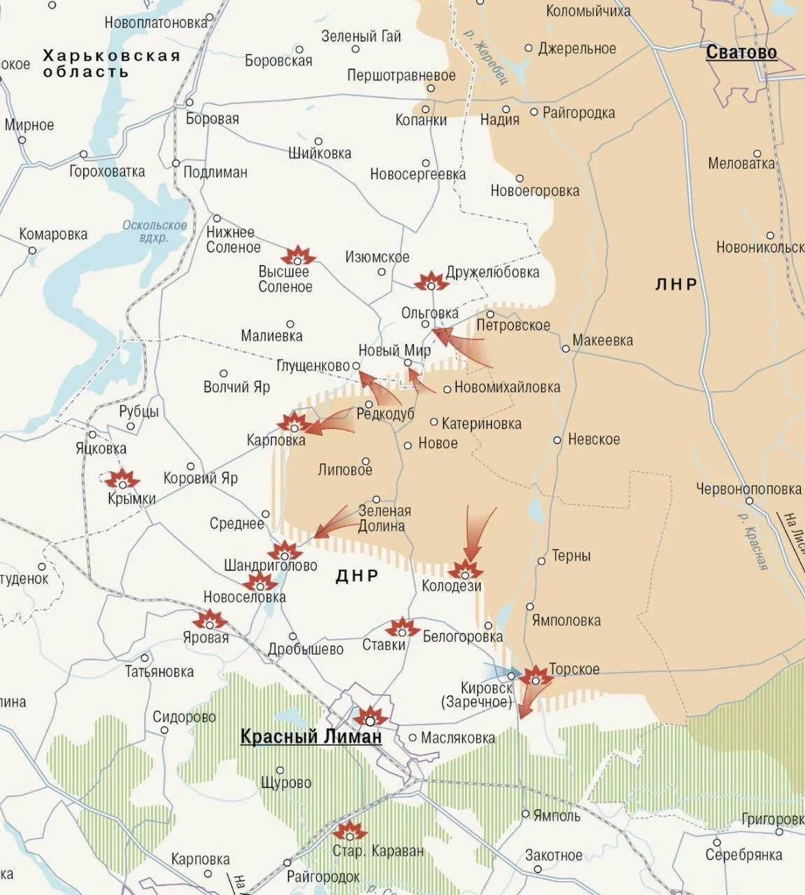 Краснолиманское направление: Торское практически освобождено, ВС РФ штурмуют Заречное, форсировав р. Жеребец. Ресурсы противника признают мощное продвижение наших бойцов на территории Кременских лесов в направлении Серебрянки. Бои идут в Среднем и Шендриголово.