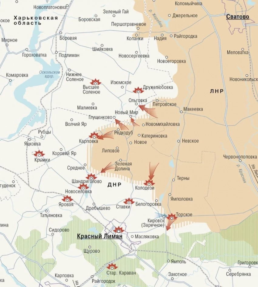Краснолиманское направление: Торское почти освобождено, штурм Заречного, форсирование Жеребца. В Кременских лесах наши продвигаются к Серебрянке, бои в Среднем и Шендриголово.