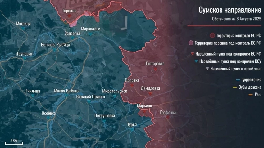 Сумское направление: здесь оперативная пауза, но позиционные бои в районе Кондратовки, Алексеевки и Андреевки продолжаются. В Юнаковке с тяжёлыми боями ВС РФ продвигаются в селе и восточнее него.