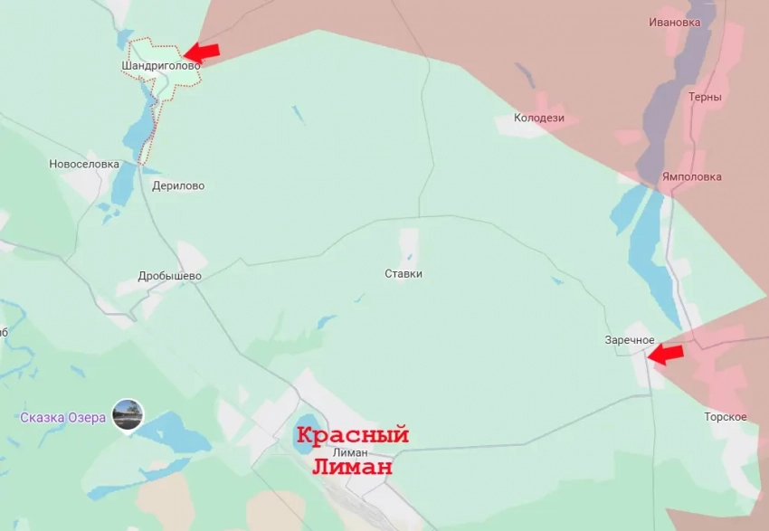 Дело в том, что продвижение армии России идёт не только севернее Красного Лимана, но и восточнее. Как уже сообщало «Военное обозрение», ВС РФ форсировали реку Жеребец и вошли в пгт Заречное, что в 8 км к востоку от города.