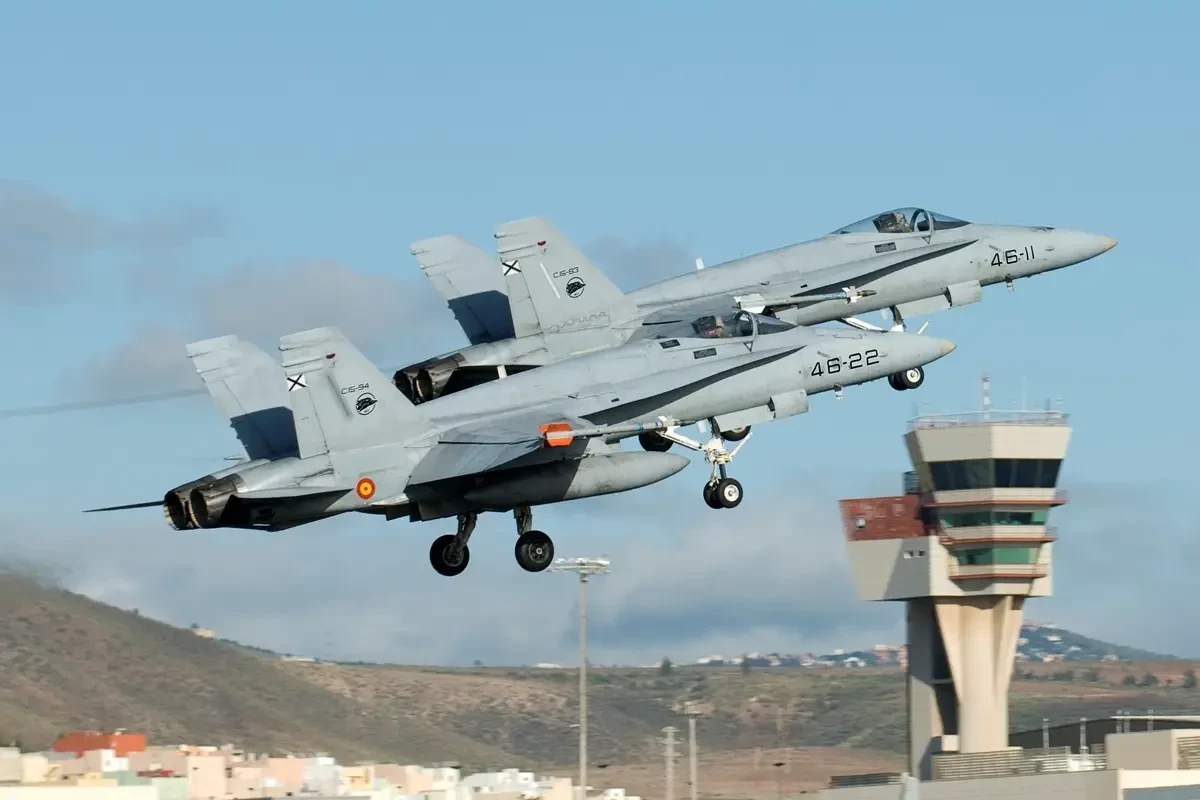 Пара F/A-18A+ из 46-го авиакрыла ВВС Испании взлетают с авиабазы Гандо , Гран-Канария , в феврале 2008 года
