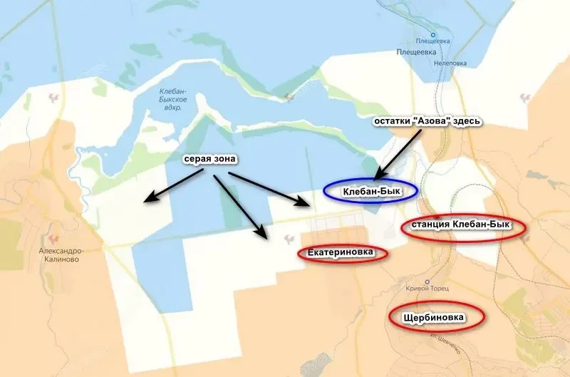 Российские войска в районе Клебан-Быкского водохранилища на Константиновском направлении добивают остатки попавших в окружение формирований ВСУ, не пожелавших сдаться. Фактически под противником остается село Клебан-Бык, тогда как северная часть Екатериновки находится в серой зоне.