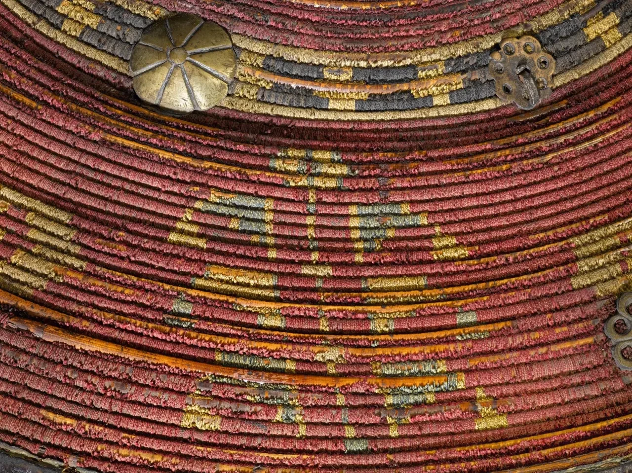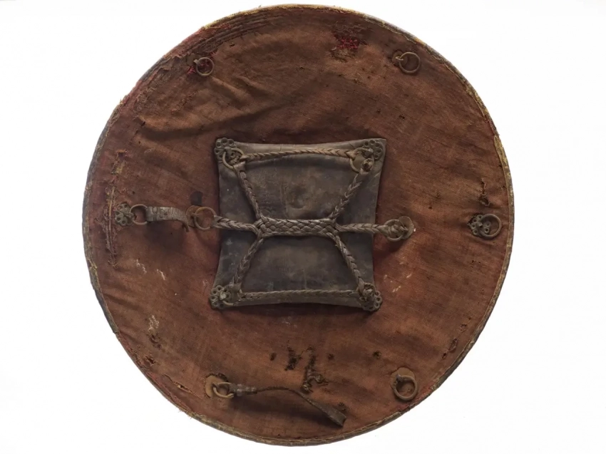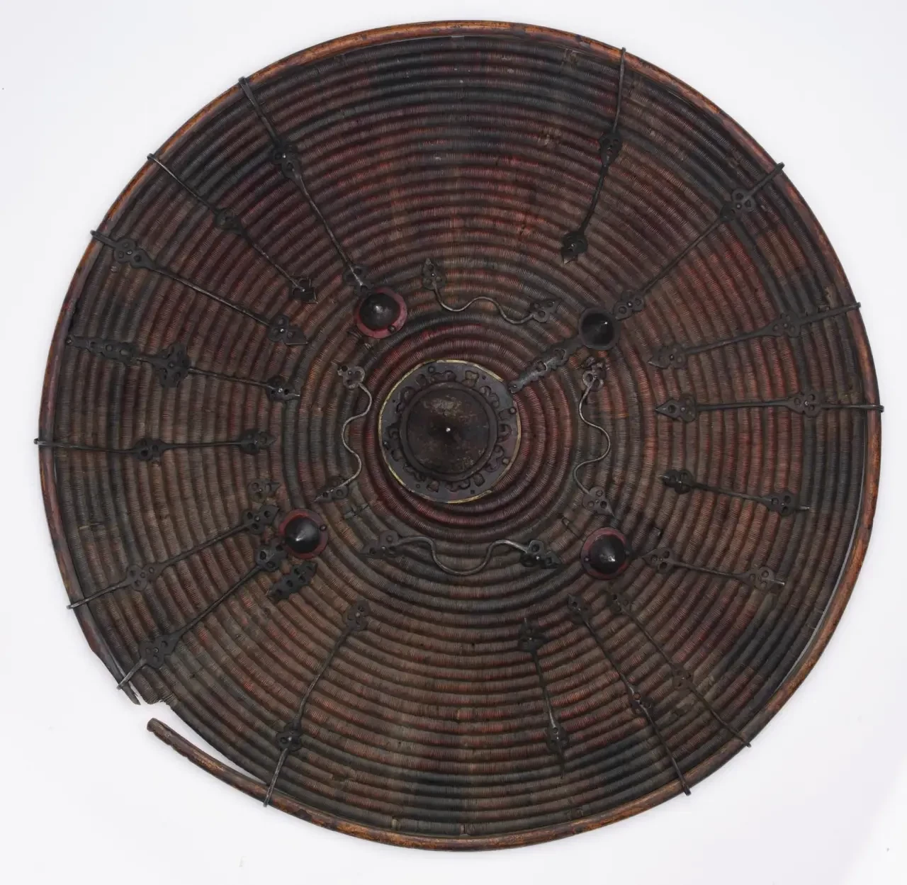 Ну а мы сейчас начнем знакомство с коллекцией музея в Лидсе с плетеного щита из Тибета, относящегося к XV-XXII вв. Кстати, очень похожий на него щит имеется и в музее Метрополитен. То есть, было их много, и потому много их и сохранилось. Интересно, что по похожей технологии и с такой же фурнитурой в Тибете делали и сундуки – прочные, но легкие и вместительные.