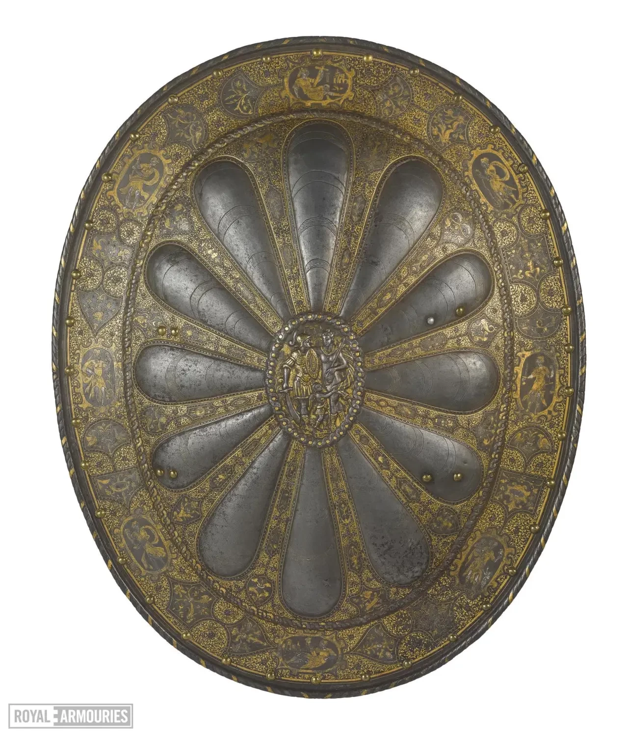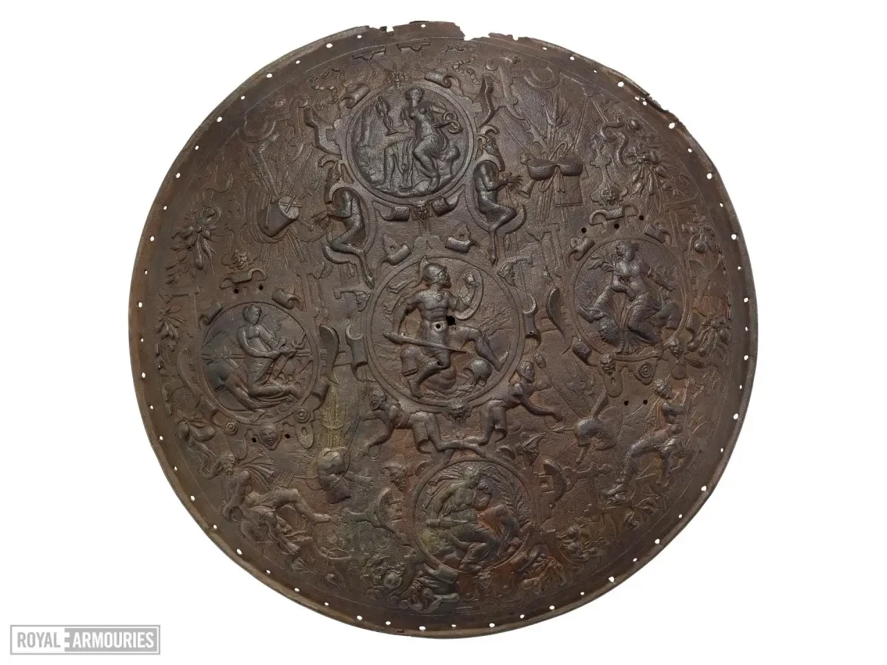 Парадный миланский щит 1500-1599 гг. Северная Италия. Предположительно он был изготовлен в мастерской Лучио Пичинино. Экспонируется в Тауэре, Лондон
