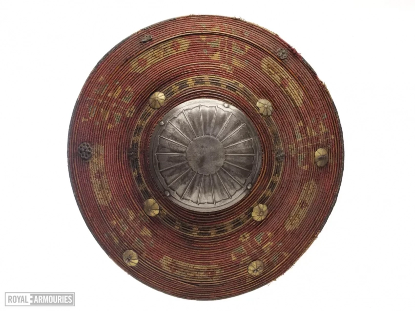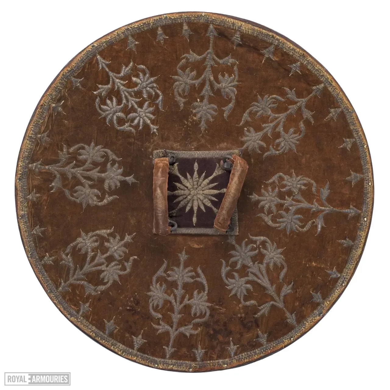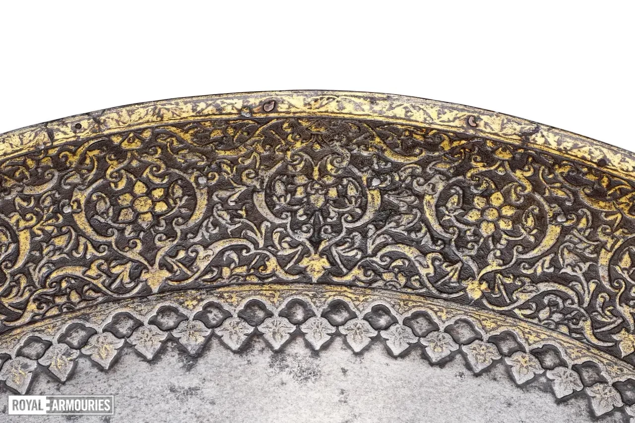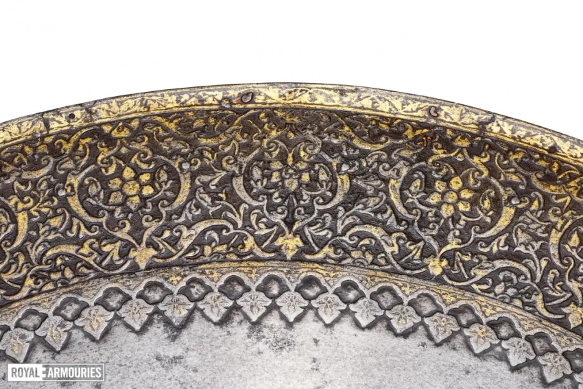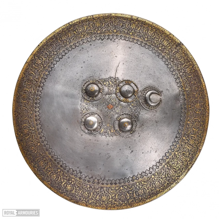 А вот Восток («дело тонкое») с боевым применением щитов подзадержался. Вот, например, щит «дхал» конца XVIII — начала XIX в. Изготовлен в Лахоре, Пенджаб, Индия. Щит стальной, круглый, слегка выпуклый. Широкая кайма и центральная часть украшены низким рельефом с арабесками и цветами, позолоченными на тёмном фоне. Четыре невысоких умбона и полумесяц служат заклёпками для внутренних колец, удерживающих рукояти. Их основания представляют собой изящные металлические медальоны с ажурной резьбой. Внутренняя поверхность, накладка и две рукояти обтянуты коричневым бархатом, возможно, первоначально пурпурного цвета. Большая часть внутренней поверхности покрыта вышитыми золотыми нитями узорами, включая восемь высоких цветочных побегов, тянущихся от края к центру, и звезду на подушечке за петлями для рукояти. Вес щита 3,52 кг. Диаметр 58 см.