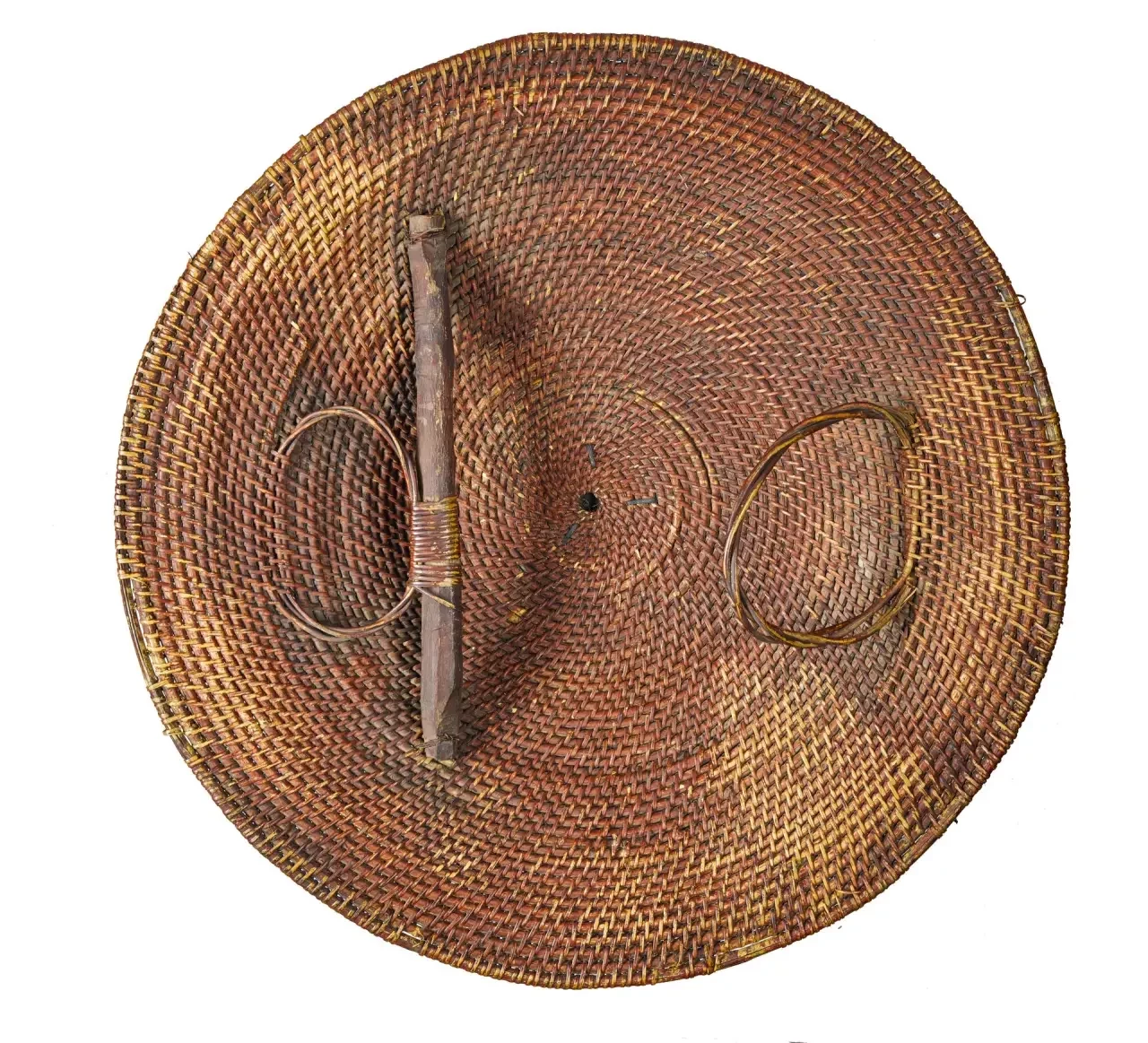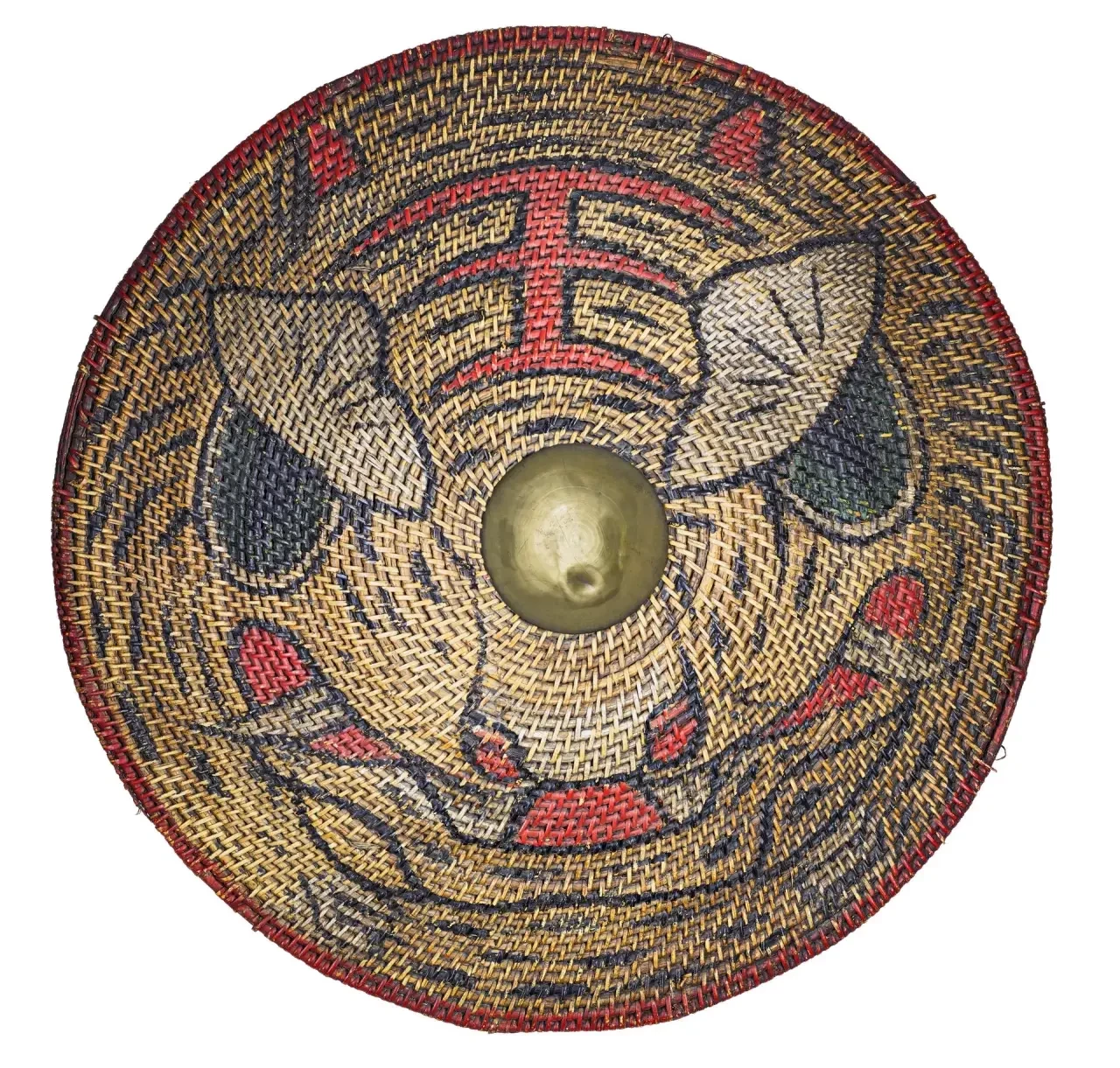 Этот большой щит имеет круглую форму и округло-выпуклое сечение. Он изготовлен из тростника, сплетенного с ротангом, с тонким латунным умбоном в центре. Лицевая сторона украшена традиционной тигриной мордой, а тыльная сторона – красной. Щит имеет две тростниковые петли для предплечья и кисти, а также толстую прямую деревянную рукоять. Материалы: тростник, ротанг. Диаметр щита: 875,0 мм. Вес щита: 4,176 кг.