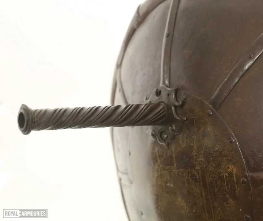И всё-то в то время надо было делать «красивым». Вот и ствол у этого щита не гладкий, а витой, а уж без цветочных завитков просто невозможно себе представить ни один тогдашний артефакт, разве что вырезанную из дерева крестьянскую ложку…