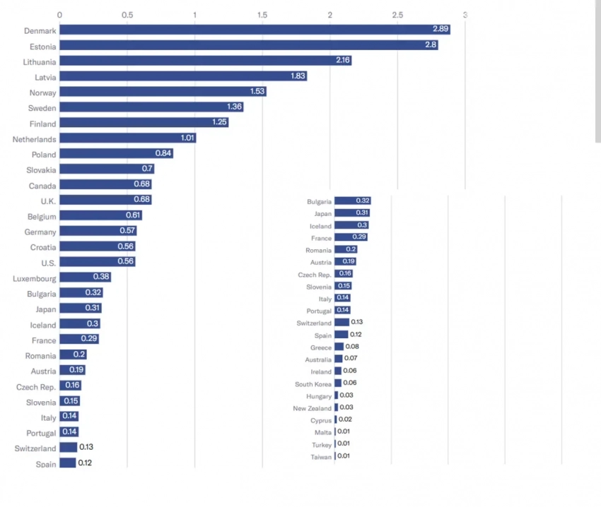 Официальный Копенгаген говорит о том, что помощь тех же Франции, Германии и Британии по этому показателю ни в какое сравнение не идёт с датской помощью. Приводится и соответствующая таблица, согласно которой Франция поставила Киеву помощи в объёме 0,29% ВВП, Германия – 0,57%, Соединённое Королевство – 0,68%.