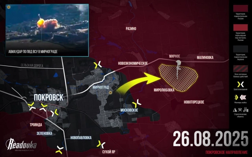 На Покровском участке, в районе Удачного продолжаются бои в северной части села. Упорное сражение в Леонтовичах и Троянде. Сообщают, что в районе Чунишино ВСУ потеснили наших бойцов, идут интенсивные встречные схватки. На северном охвате ВС РФ продолжают штурм Родинского. ВКС РФ нанесли ряд авиаударов по окрестностям Доброполья. Были поражены рембазы, логистические узлы и склады. В районе Шахово продолжаются упорные бои.