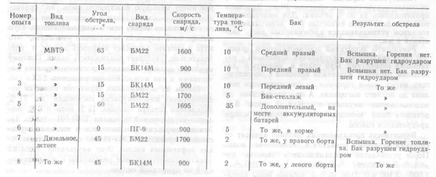 Результаты обстрелов сведены в таблицу, которая приведена ниже. Там указаны и углы обстрела, и температура чистого топлива и водотопливной (МВТЭ в таблице) микроэмульсии, и последствия попадания. Как можно заметить, водотопливная эмульсия вполне доказала свою эффективность — горючее в таком виде становится намного более безопасным в плане устойчивости к возгоранию.