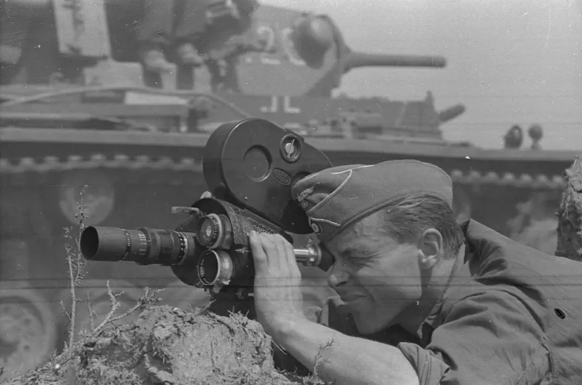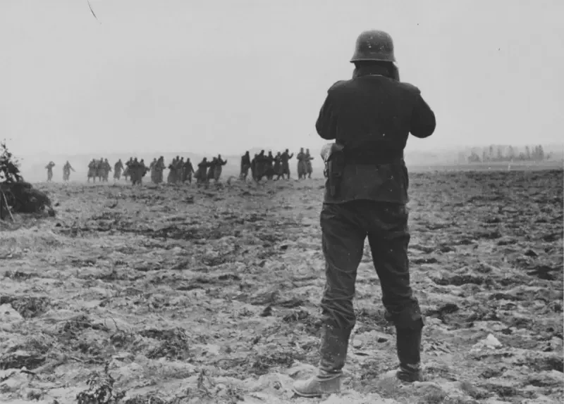 Кинооператор роты пропаганды снимает колонну советских военнопленных
