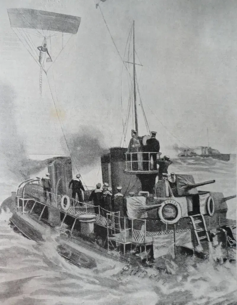 Очень интересное фото на военно-морскую тему из журнала «Нива» за 1904 г. Вот так, запуская с палубы миноносца воздушный змей с корзиной с наблюдателем, в начале ХХ века предполагалось вести дальнюю разведку! Фото автора.