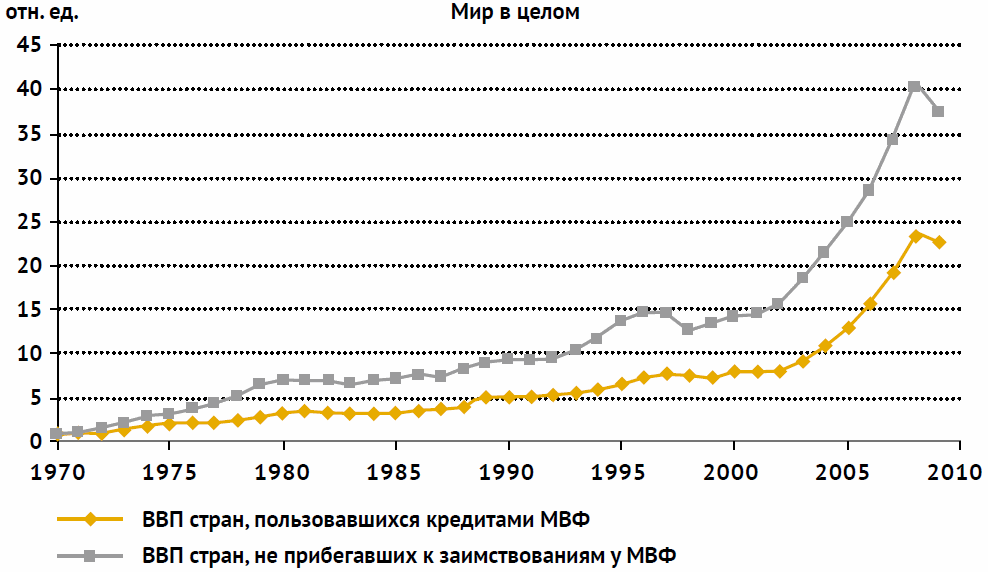 Рис. 1. ВВП стран, (не) прибегавших к заимствованиям у МВФ