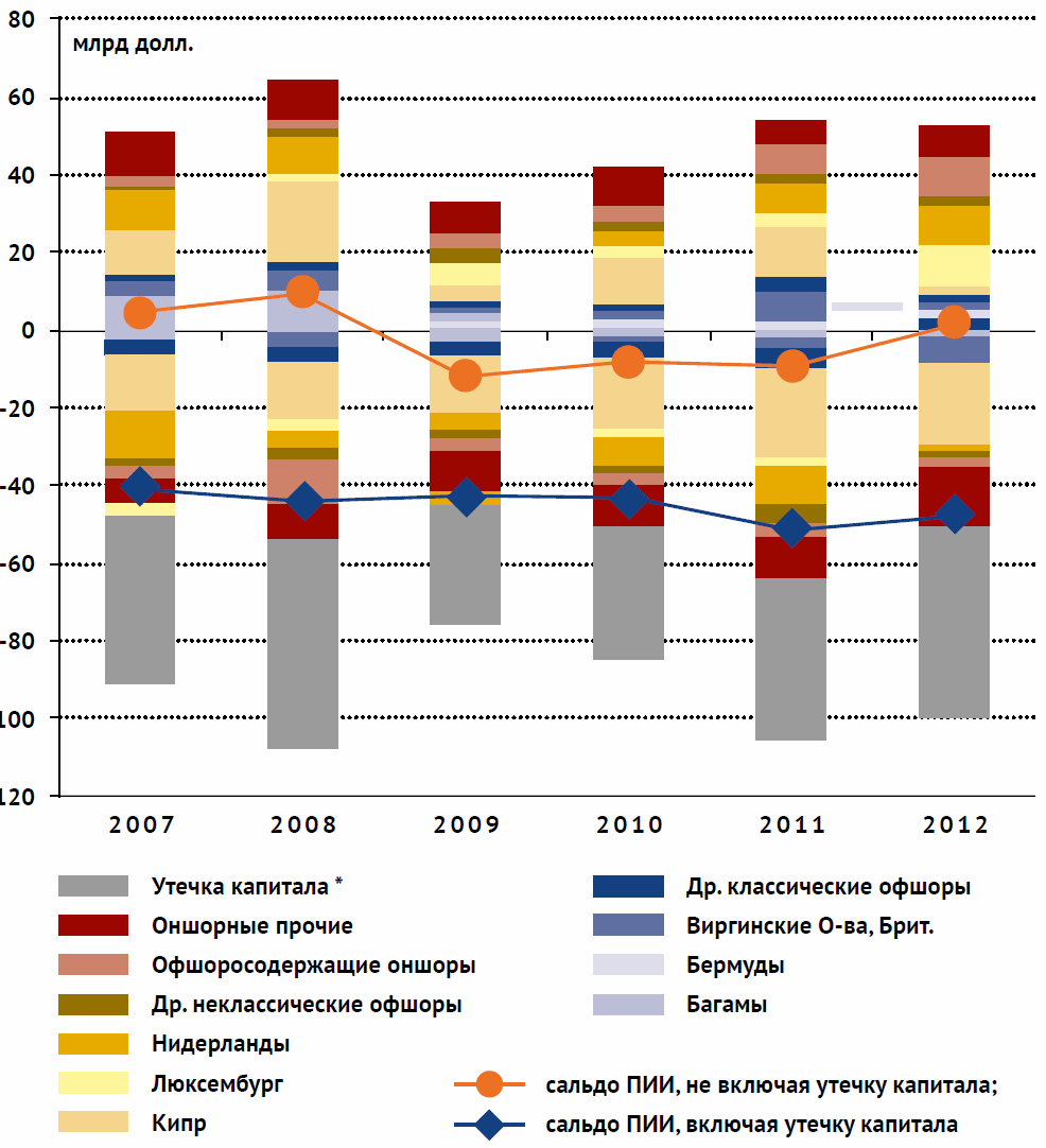 Рис. 4. Офшоризация российской экономики. Потоки** инвестиций в Россию (+) и за границу (-) по странам и типам юрисдикций (офшорам и оншорам), млрд долл. (Источник: Петров Ю. К формированию новой экономической модели: рестрикция бюджетных расходов или повышение собираемости налогов? // Российский экономический журнал. 2013. № 4).