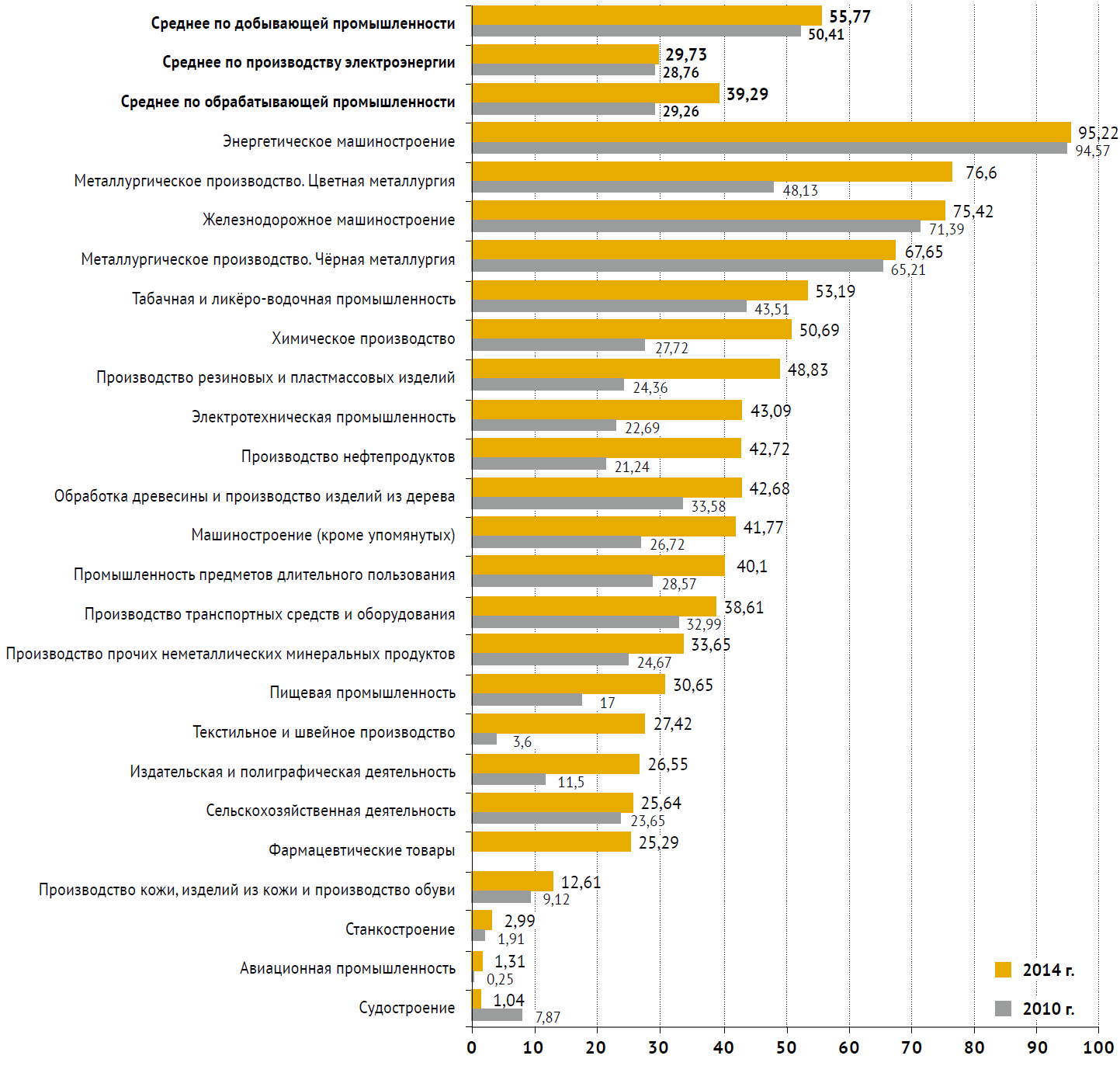 Рис. 5 Доля иностранного капитала в отраслях промышленности России за 2010–2014 гг. (Источник: Цыпин А.П., Овсянников В.А. Оценка доли иностранного капитала в промышленности России // Молодой учёный. 2014. № 12. С. 195-198. URL https://moluch.ru/archive/71/12215/ (дата обращения: 05.04.2018).
