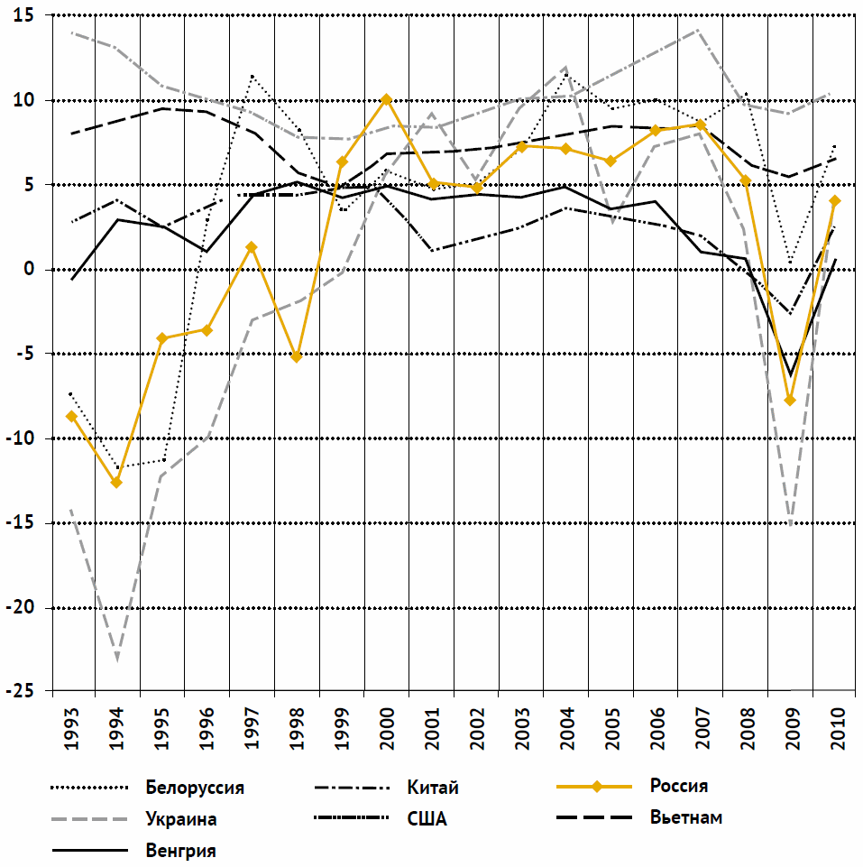 Рис. 6 Темпы прироста ВВП ряда стран в 1993–2010 гг., % к предыдущему году.