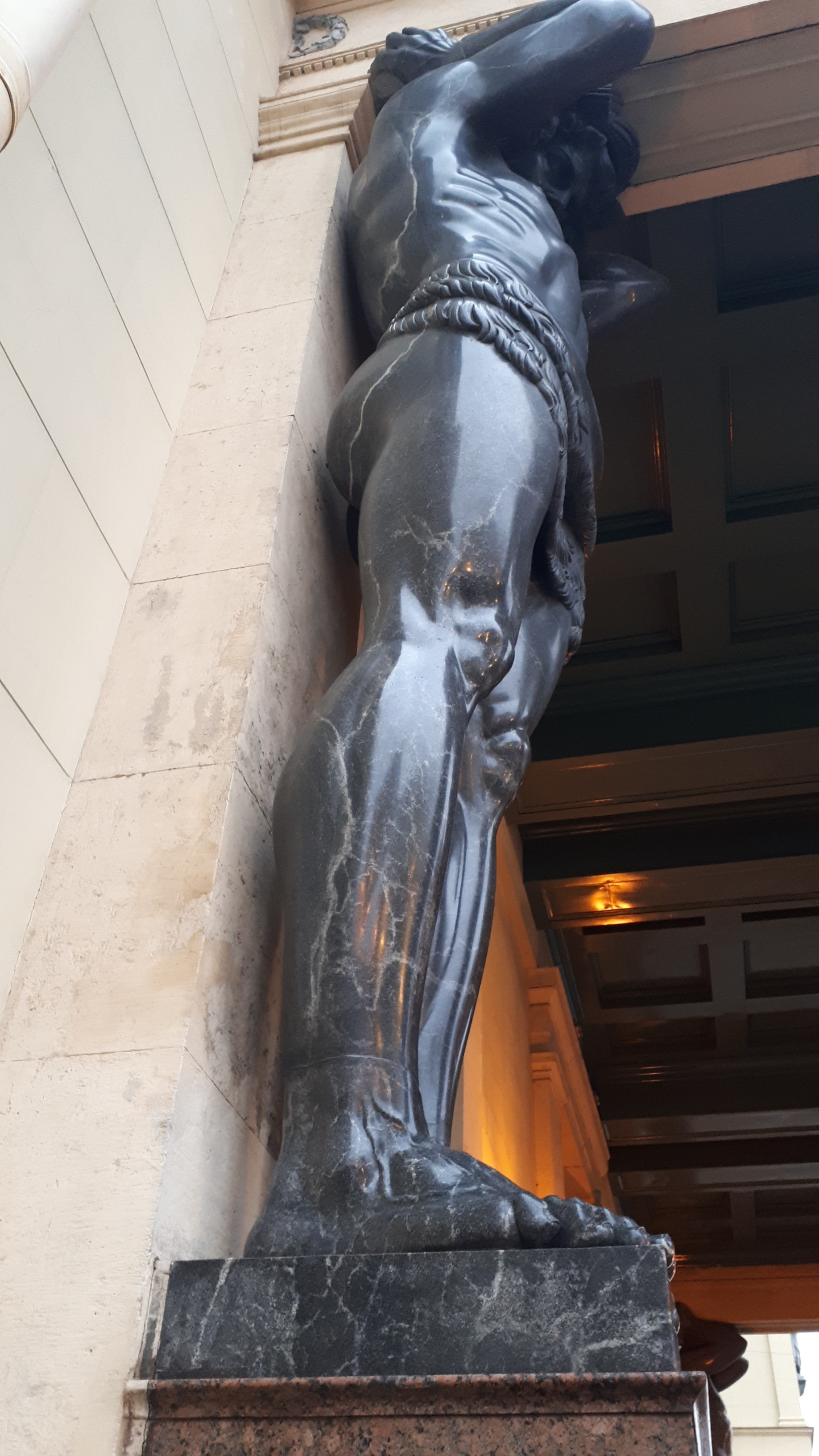 Это же касается и атлантов Малого Эрмитажа. Они не имеют следов явной эрозии, что и понятно. Они под козырьком, всегда сухие. Кроме того, в этом месте затишек, сильного ветра и тем более с ветра с песком и пылью там не бывает. Условия сохранности близки к тем что внутри помещений. А где эти атланты были до установки на данном месте, никто не знает. Кстати, раз речь зашла об атлантах, немного отвлекусь. Последние годы на ряде ресурсов и некоторыми исследователями из числа любителей истории продвигается мысль о том, что атланты отлиты из искусственного гранита. При этом по какой технологии никто не знает. И все они якобы отлиты в единой матрице, то есть все одинаковые. Так вот, это заблуждение. Все атланты разные. И даже не только в деталях, типа рисунка складок на набедренных повязках, но и в геометрическом плане. Кто не верит, возьмите рулетку и сходите померяйте. В частности длина ступни варьируется в дельте 0,5-1,5 см. Фото с рулеткой и замерами не буду выкладывать, выложу фото с карточкой метро, по полоске на ней очень хорошо видно что пальцы свисают по-разному.
