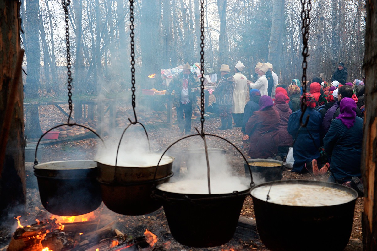 В лесу стоят котлы, в которых варятся жертвенные гуси. Перед этим у них отрезали крылья, головы и лапы и бережно выложили на деревянные подносы. Неподалеку из крови жертвенных животных и смеси круп делаются «котлеты». Никто к блюдам не прикасается, пока все в едином порыве не прочитают молитву у каждого из пяти кострищ.