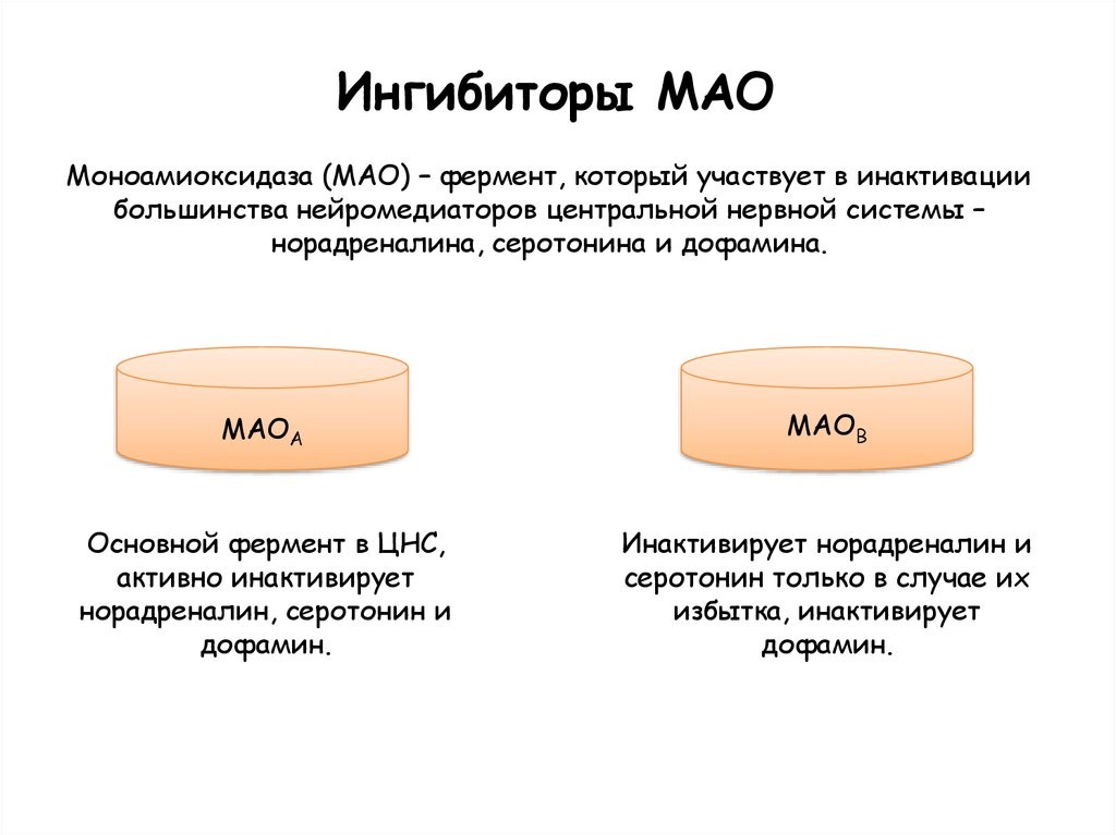 При депрессии — самой модной хворобе в наше время — нарушен как суммарный уровень различных моноаминов в головном мозге, так и их соотношение. А раз так, то медикаментозное лечение депрессии должно быть направлено на исправление этих нарушений. Один из способов решения этой задачи — ингибирование (подавление активности) МАО. В самом деле, если МАО будет медленнее разрушать моноаминовые нейромедиаторы, они станут накапливаться в ткани мозга, и депрессия отступит.