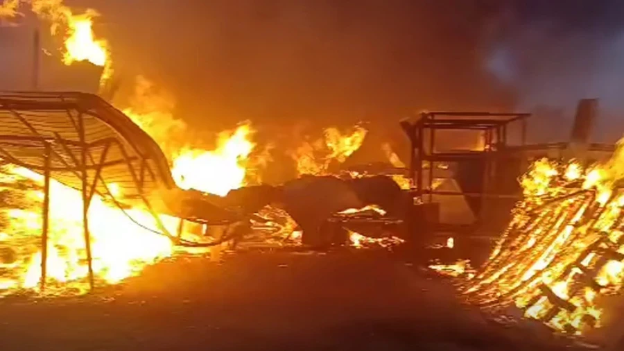 Предварительно установлено, что огонь возник среди сложенных досок и затем распространился на другие участки.