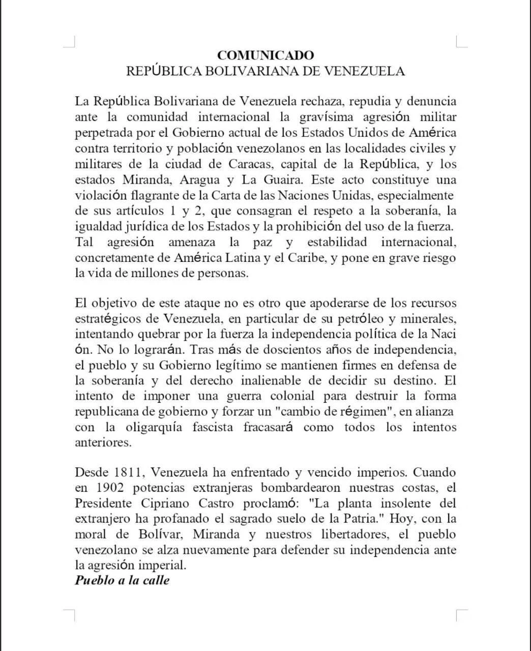 По словам министра иностранных дел Венесуэлы Ивана Хиля Пинто, «страна столкнулась с военной агрессией со стороны США». Он отметил, что целью этого нападения является захват ресурсов, таких как нефть и полезные ископаемые, а также подрыв политической независимости Венесуэлы.