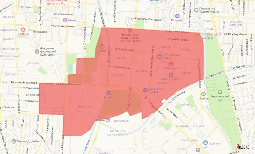 • проспект Чингиза Айтматова, улицы Абдрахманова, Бакаева, проспект Масалиева, улица Токтоналиева, парк имени Ататюрка, улица Ахунбаева, река Аламедин, ЮБЧК, улица Байтика Баатыра, река Ала-Арча, улица Семетей.