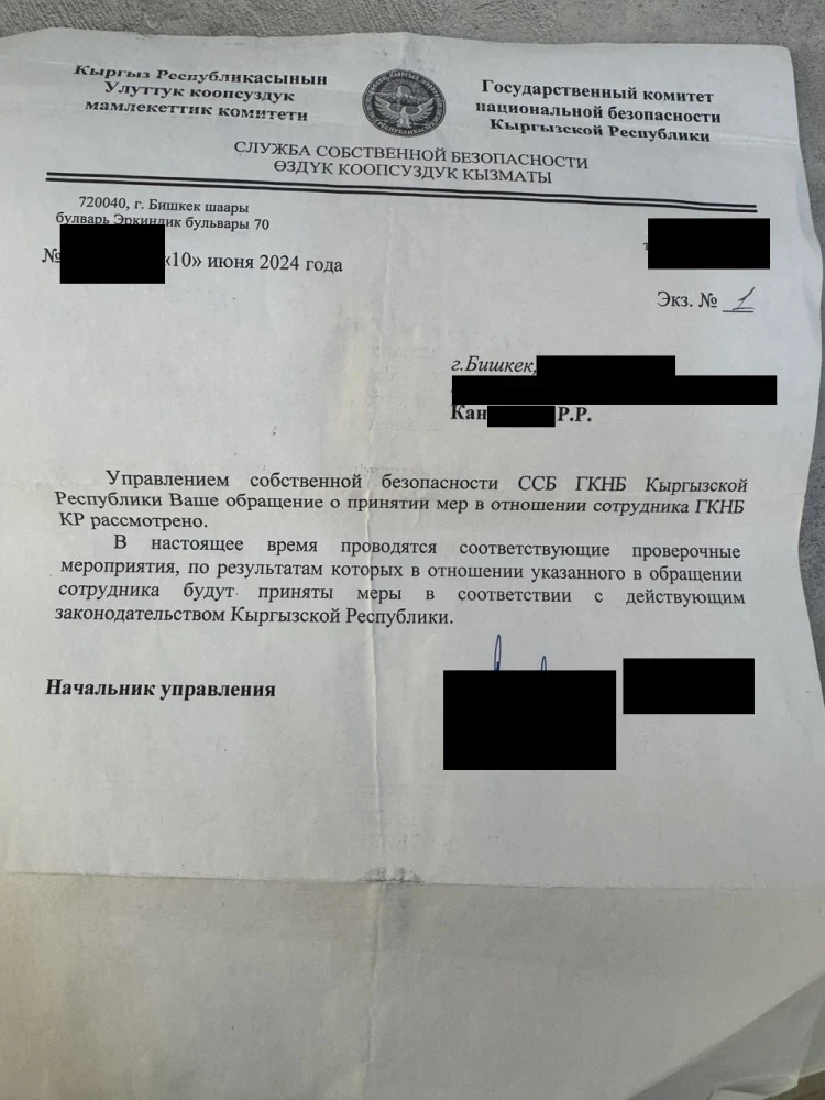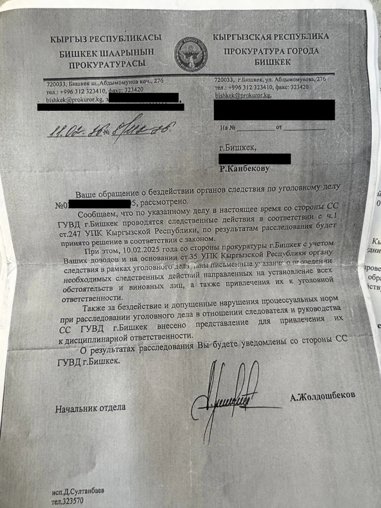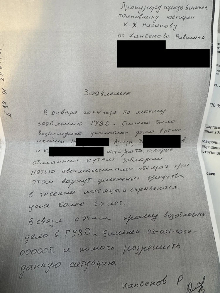 "В январе 2024 года я решил подать заявление в ГУВД Бишкека. Оно было принято, и дело из Ленинского РУВД было истребовано, после чего было возбуждено уголовное дело по статье о мошенничестве. После этого обвиняемые снова вышли на связь и пообещали вернуть деньги в течение месяца. Однако они снова исчезли. В милиции дело приостановили, не уведомив меня", - добавил Канбеков.Канбеков выяснил, что Кайрат работает в Государственном комитете нацбезопасности Кыргызстана, и направил заявление в ГКНБ. Он также пытался назначить встречу с генералом Камчыбеком Ташиевым, но безуспешно. В ответ на его обращение в ГКНБ ему пообещали принять меры.