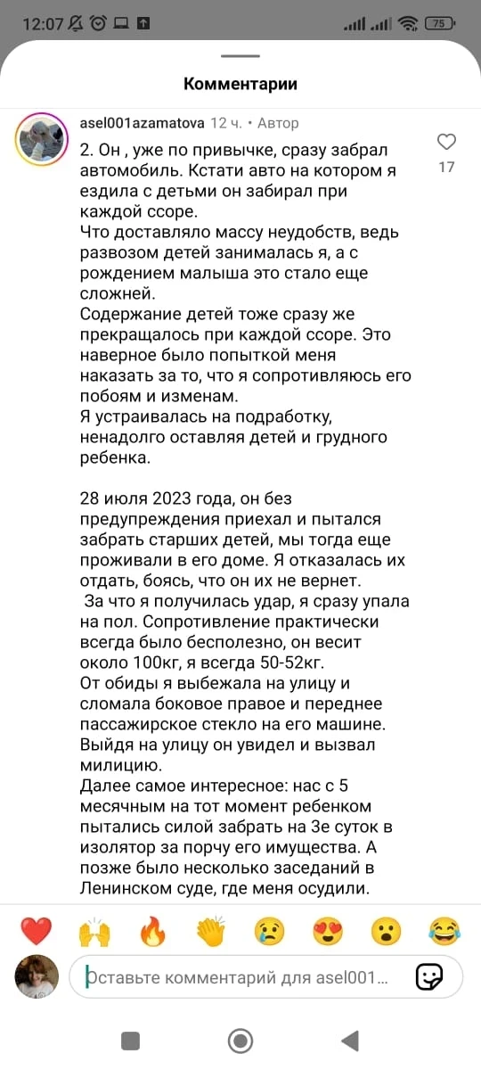 В своем сообщении Асель упоминает о систематическом насилии со стороны парламентария, которое, по ее словам, началось после его избрания в начале 2022 года.