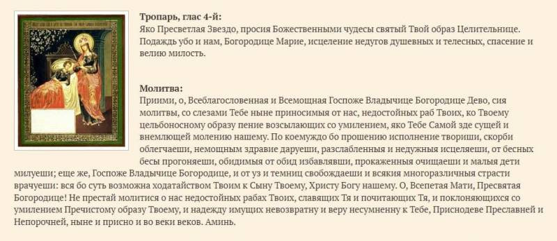 Иконе с названием “Целительница” молятся в основном о выздоровлении от различных заболеваний. Люди просят не только за себя, но и за своих родственников. Народ верит, что если попросить у священного образа вылечить даже самое коварное и серьезное заболевание, то это произойдет в реальности. Женщины, которые не могут иметь детей, просят у иконы благословения в зачатии малыша. Те, кто находится на смертном одре, просят у иконы облегчить их страдания.