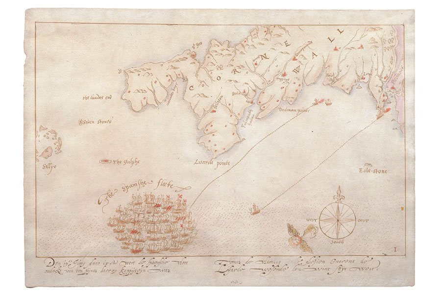Угроза испанского вторжения летом 1588 года армады из 138 испанских военных кораблей вызвала ужас в Англии, но меньший английский флот оказался более быстрым и мобильным. Карты отслеживают серию сражений у побережья, некоторые в пределах видимости суши, до того, как погода вмешалась на английской стороне и осенние бури рассеяли Армаду; десятки кораблей потерпели крушение у шотландских и ирландских берегов, пока ковыляли домой. Карты, безусловно, основанные на свидетельствах очевидцев, возможно, были заказаны адмиралом лордом Ховардом Эффингемским, но в его окончательном отчете использовался набор гравюр королевского картографа Роберта Адамса и гравера Августина Райтера — полный набор есть в Британском музее — который уже был опубликован.