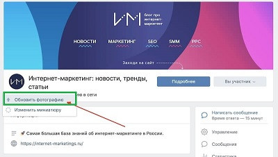 Для загрузки изображения потребуется посетить страницу паблика, тапнуть на имеющийся аватар и во всплывающем меню отыскать графу «Обновить фото».