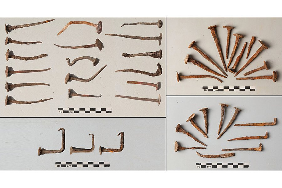 Совсем не часто встречается 41 сломанный и согнутый ноготь, обнаруженный по краям ожоговой зоны. Двадцать пять гвоздей были намеренно согнуты под углом 90°, а шляпки отвернуты. Шестнадцать были преднамеренно согнуты или скручены, но все же с головами. Они не могли быть использованы в практических целях (например, при сооружении костра), а их распределение по периметру костра указывает на то, что они были размещены.