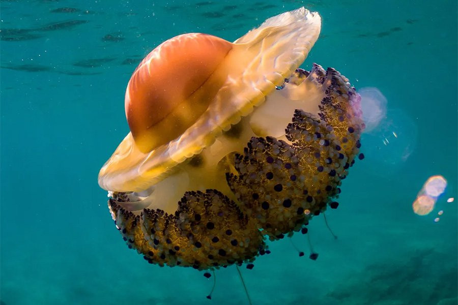 Одним из таких видов является Cotylorhiza tuberculata, так называемая медуза-глазунья. Похожие на желе из яичного желтка, эти округлые колокольчики могут пульсировать для активного плавания, хотя они проводят большую часть своего времени неподвижно. Такие животные, как крабы, любят кататься на этих желейках, безопасно курсируя на не жалящем конце.