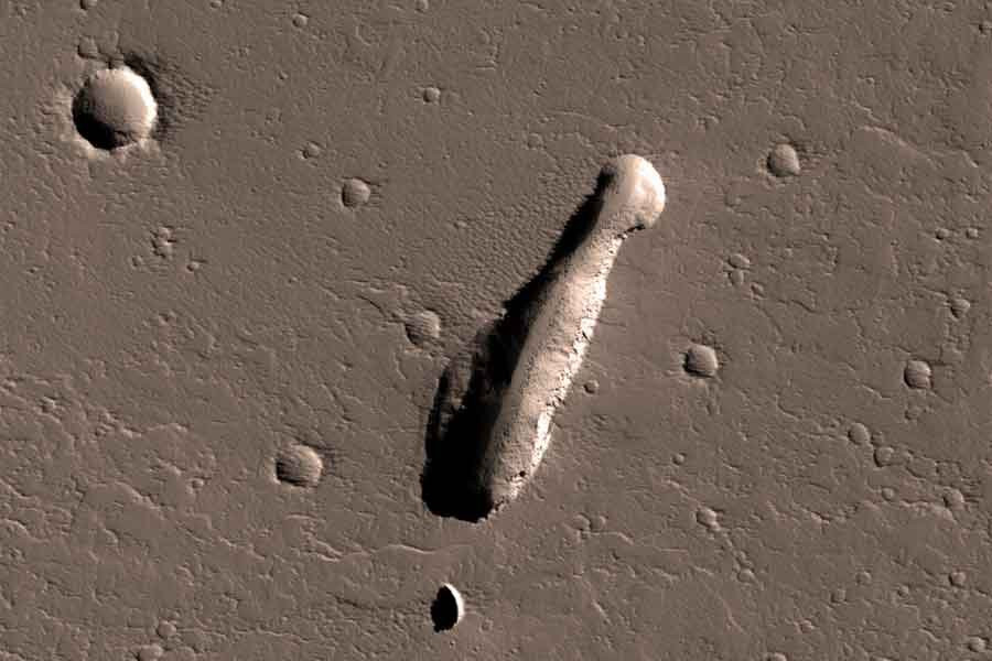 Исследовательский зонд Mars Reconnaissance Orbiter, работающий на орбите Марса, сфотографировал странный объект, расположенный в районе Керауниус Фоссе. Пользователи Сети не могут понять, что изображено на снимке — возвышенность или впадина.