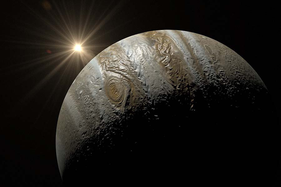 Ио находится в неровной части солнечной окрестности. Спутник не только вращается близко к Юпитеру, где гравитационный колодец крутой, но и находится в орбитальном резонансе со спутниками Европой и Ганимедом; вокруг Юпитера четыре раза за время, необходимое для совершения двух и одного оборота соответственно. Приливные силы, создаваемые этим гравитационным танцем, поддерживают внутри Европы достаточно тепла, чтобы иметь внутренний океан, но в случае с Ио они настолько сильнее, что Луна состоит из шара горячей магмы.