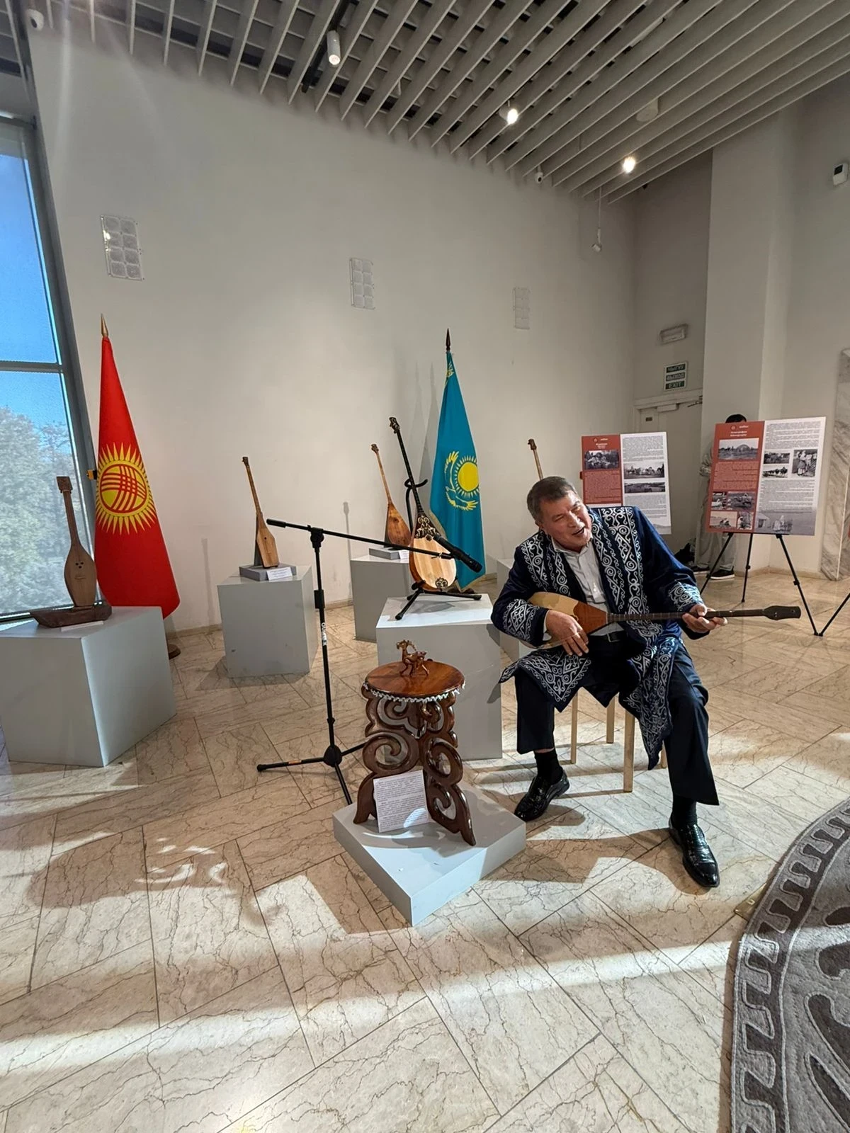 Особое внимание в выставке уделено музыкальным инструментам, копии которых принадлежали известным деятелям казахской культуры, таким как Абай Кунанбаев, Жамбыл Жабаев, Дина Нурпейисова и Кенен Азербаев. Эти экспонаты представляют собой не только историческую, но и духовную ценность, демонстрируя преемственность национальных традиций и богатство музыкального наследия Казахстана.