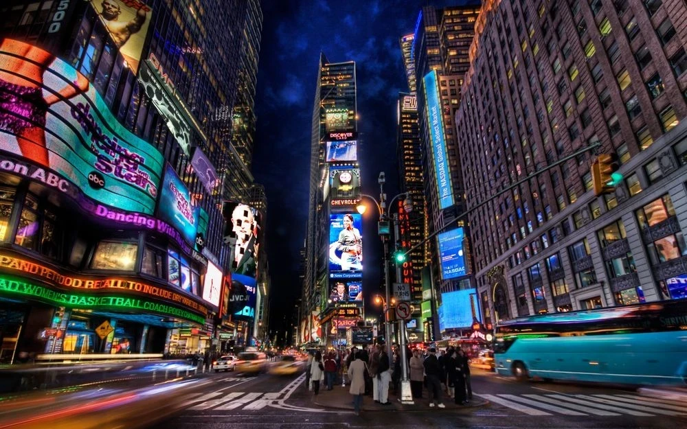 Таймс-сквер — это знаковая точка в Нью-Йорке, символизирующая ночную жизнь города. Это место, где пересекаются Бродвей и Седьмая авеню, и где свет не гаснет ни днем, ни ночью. Сотни тысяч туристов, неоновые огни, Бродвейские мюзиклы и уличные представления делают Таймс-сквер легендарным «Перекрестком мира».