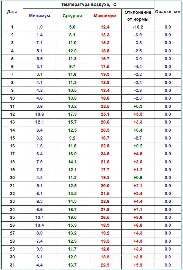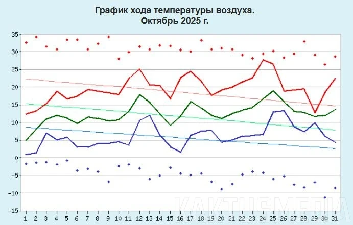 Среднемесячная температура за октябрь составила +11,6 °C, в то время как фактическая температура в 2025 году была +12,6 °C, что на +1 °C выше нормы.Норма осадков в октябре составляет 37 мм, однако в этом году осадков не было, что составляет 0% от нормы.
