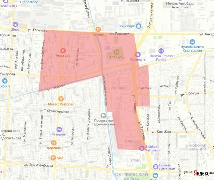 7 Апреля – мкр Улан2 - р. Аламедин – ул. Скрябина, ул. Юнусалиева – ул. М. Горького – 7 Апреля.