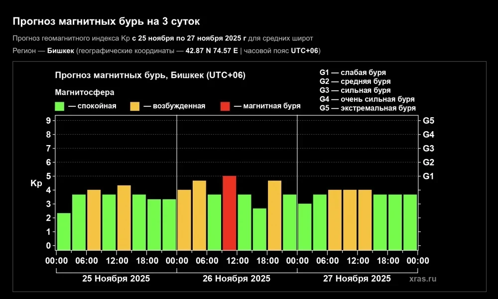 Прогноз магнитных бурь в Бишкеке на три дня.