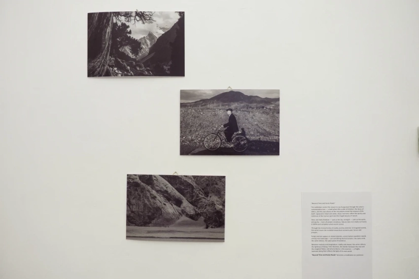 «Я стремилась размыть границы между временем — прошлым, настоящим и будущим», — поделилась своими мыслями Эльмира Хасанова. — «Эта серия работ рассказывает о моих путешествиях по Кыргызстану. Я хотела показать, как лучшие моменты запечатлеваются в искренних улыбках людей и в разнообразии природных пейзажей. Мой проект связывает реальность и воображение, где кыргызские женщины оказываются на других планетах, а странник эпохи постгуманизма стоит среди натуральных ландшафтов Кыргызстана. Суть выставки заключается в вечности: в том же ветре, в той же тишине, в том же пульсе бытия».