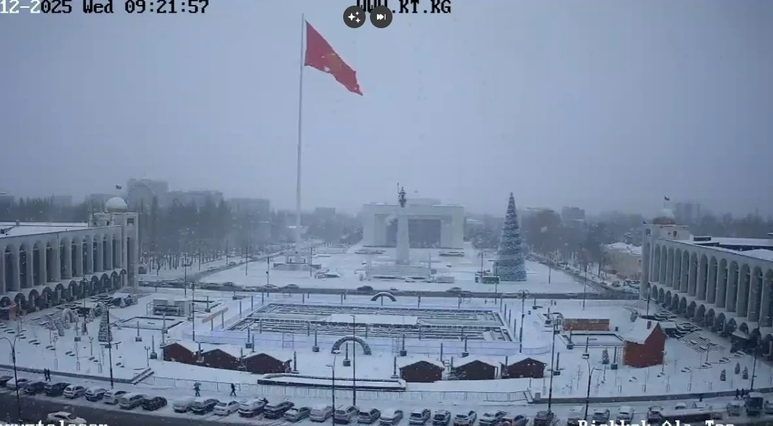 С утра город засыпало густым снегом, улицы и площади полностью укрыты белым слоем. На площади Ала-Тоо наблюдается плохая видимость, деревья и автомобили покрыты снегом, движение затруднено. Коммунальные службы работают в усиленном режиме, чтобы справиться с последствиями стихии.