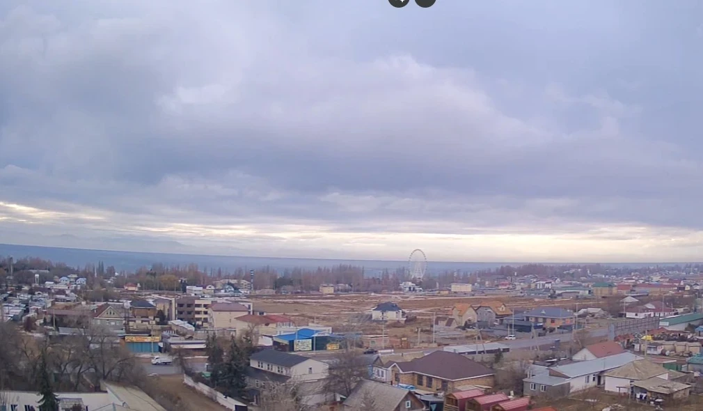 На побережье Иссык-Куля осадков не наблюдается. Камеры фиксируют облачное, но спокойное небо. Дороги свободны от снега, видимость хорошая, а над озером видны светлые участки неба.
