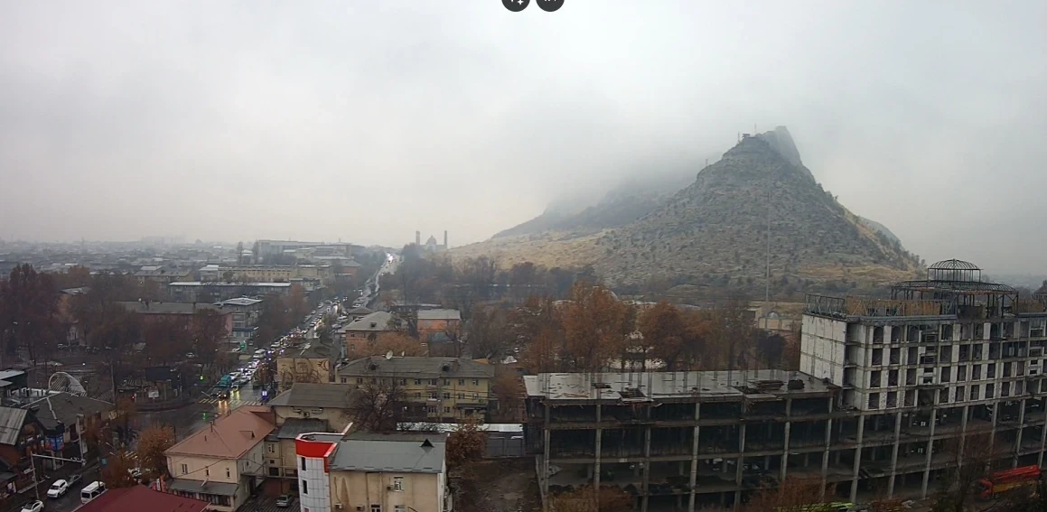 Город находится в густом тумане с низкой облачностью. Частично скрытая в тумане гора Сулайман-Тоо. Осадки минимальны, но высокая влажность делает дороги мокрыми.