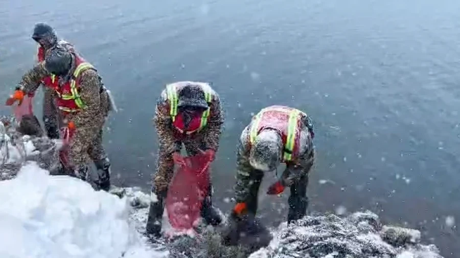 Согласно их сведениям, водолазы ведомства продолжают свою работу в устье реки Түп, несмотря на неблагоприятные погодные условия.