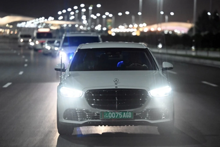 Самолет, на котором путешествовал президент, приземлился в международном аэропорту Ашхабада, где для его встречи были установлены флаги стран-участниц форума, разостлана ковровая дорожка и выстроена рота почетного караула.