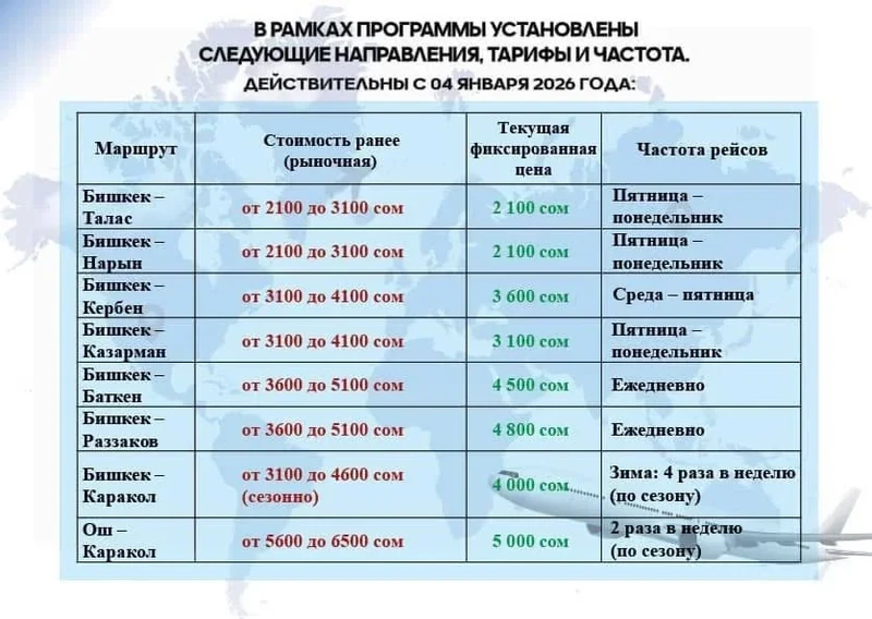 В соответствии с указанием президента Садыра Жапарова, на 2026 год предусмотрено установление цен на авиаперевозки по внутренним маршрутам ниже рыночных. Разница в стоимости авиабилетов будет покрыта средствами Стабилизационного фонда.